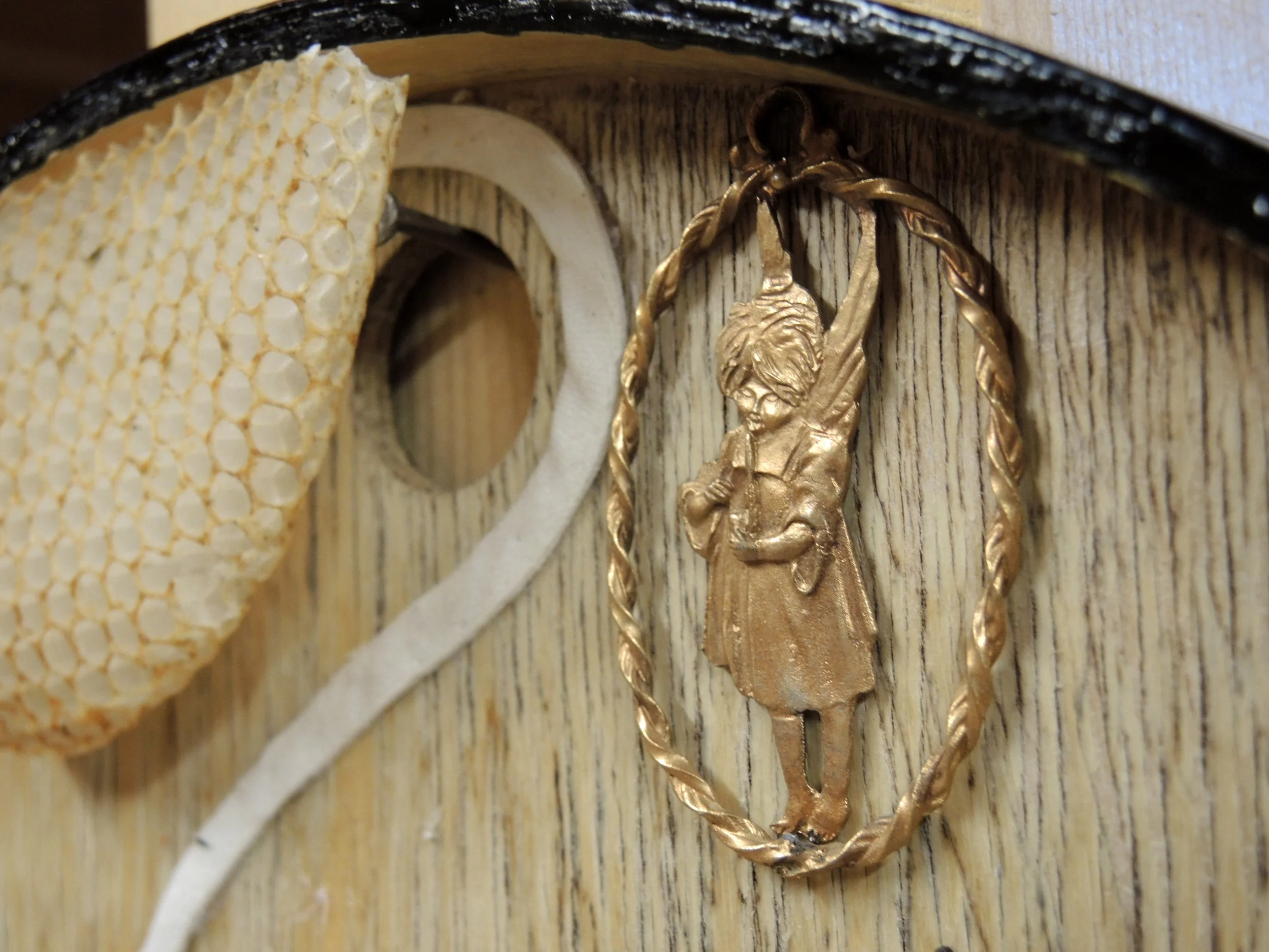 Assemblage auf altem runden Holztablett, Durchmesser 35 cm, 2022